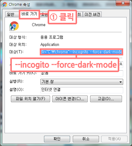 ▲ 크롬의 속성창이 나타나면, 상단에 있는 [바로가기]를 클릭한다. 그러고나서, 대상(T) 오른쪽 입력란에 맨오른쪽에 "--incogito --force-dark-mode" 라고 적어준다. 여기서 --force 앞에 뛰어쓰기를 해주자.