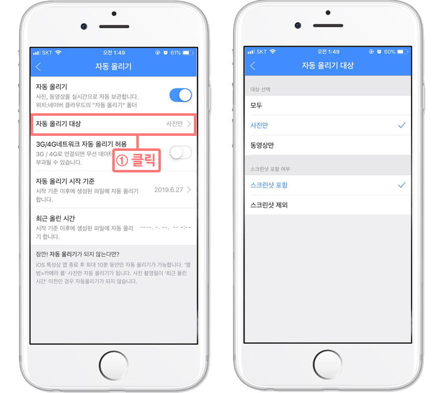 ▲ 다시 [자동 올리기] 메뉴로 돌아와, 자동 백업을 할 것들을 설정할 수 있다. 사진, 동영상, 스크린샷을 선택하여서 부분백업을 할 수 있다.