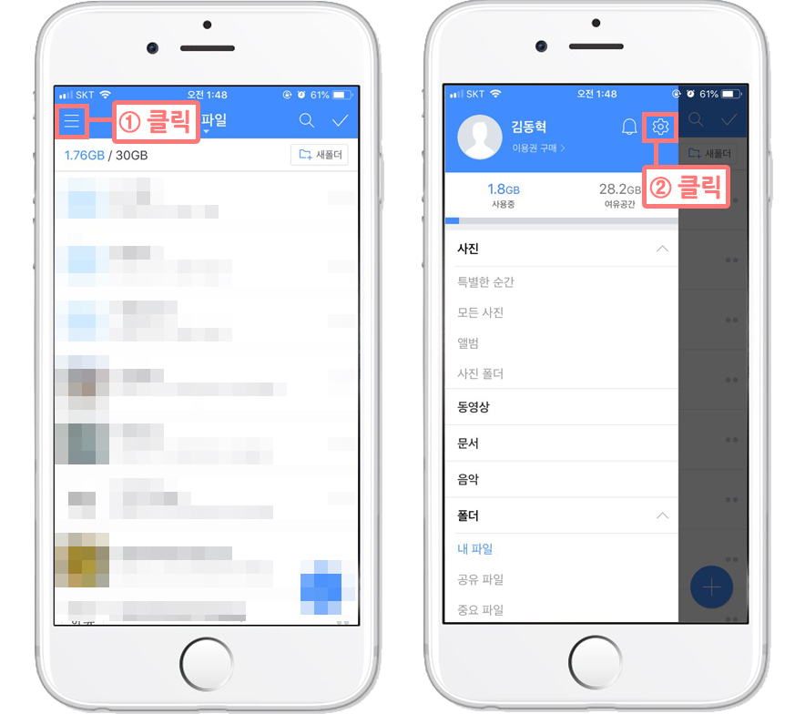 ▲ '네이버 클라우드'를 실행시키면 위와 같은 화면이 나오는데, 자동올리기 기능을 설정을 하려면 [설정] 메뉴를 들어가야 한다. 왼쪽 상단의 직선 세개가 평행한 아이콘인 [메뉴]를 누른후, 톱니바퀴 모양 아이콘인 [설정]을 클릭한다.