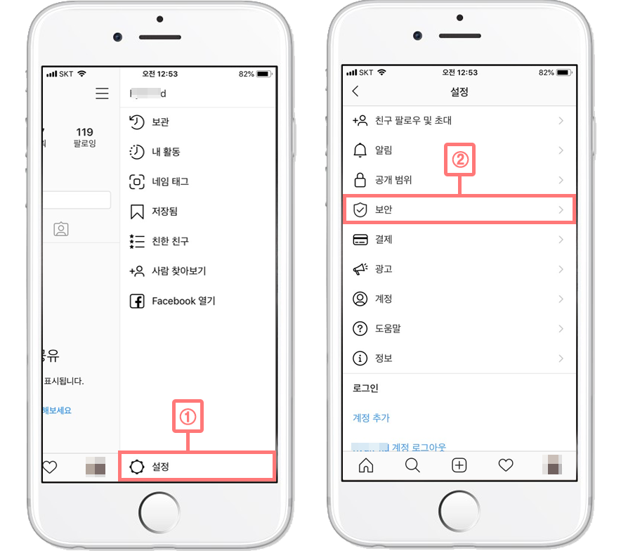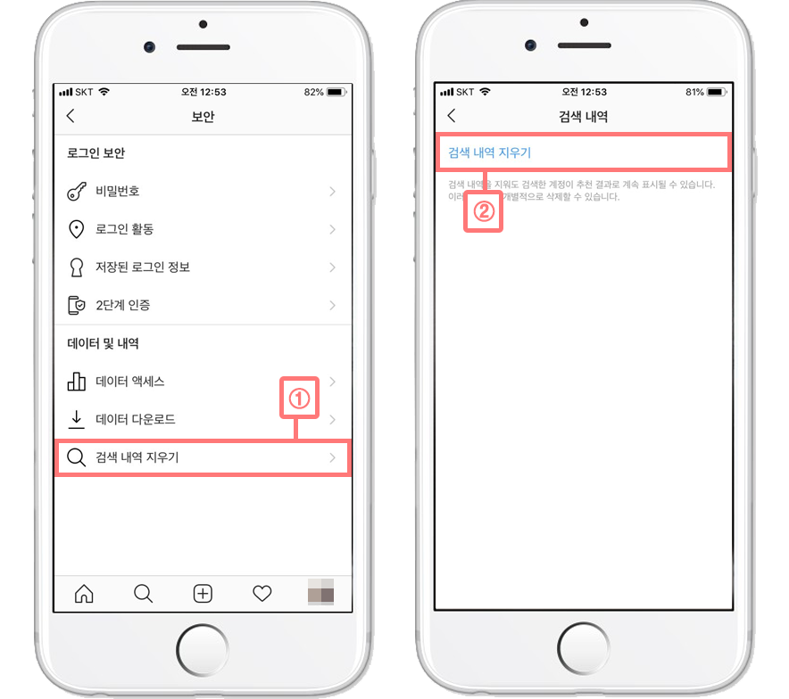 ▲ 보안 메뉴로 진입하게 되면 하단에 위치한 우리의 목적인 [검색 내역 지우기]를 클릭한다. 그런 다음 다시 한번 클릭해주면 인스타그램 최근검색기록이 삭제되어 진다.