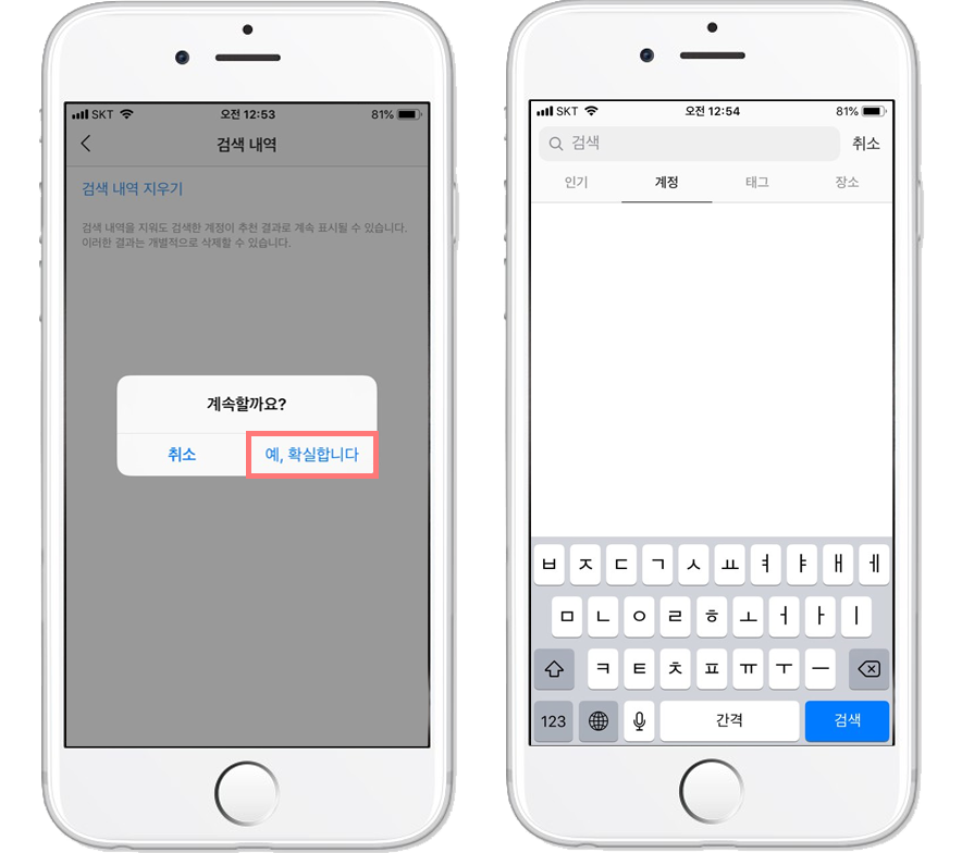 ▲ 클릭실수 방지를 위해 최근검색기록삭제를 할지 재확인을 묻는 창이 나오는데, [예, 확실합니다]를 누르면 된다. 누르면 오른쪽 이미지와 같이 인스타그램 검색기록이 말끔히 삭제된 것을 확인할 수 있다.