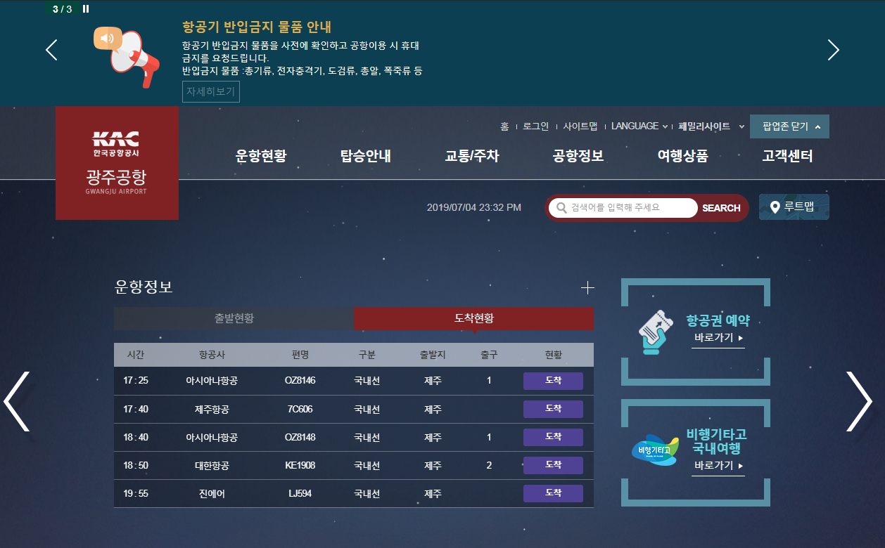 ▲ 링크를 통해 접속하거나, 검색창에 "광주공항"을 검색하여 접속을 하면 광주공항 홈페이지 메인화면이 나온다. 홈페이지에서는 주차요금 뿐만아니라, 운항정보와 항공권예약, 고객센터 등등 다양한 정보들을 확인할 수 있다.