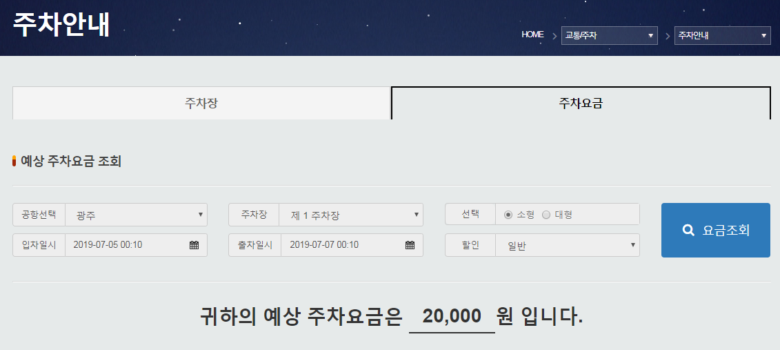 ▲ 입차일시를 7월5일 00:10, 출차일시를 7월7일 00:10 으로 가정한 후, 요금조회를 해보면, 광주공항 예상 주차요금은 20,000원이 나오는 것을 확인할 수 있다.