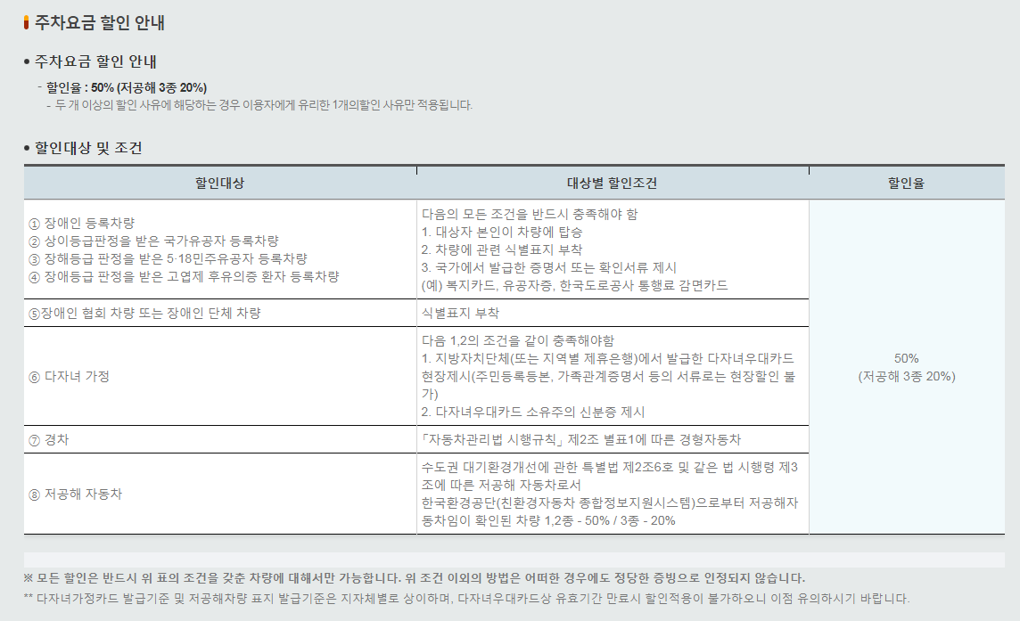 ▲ 광주공항 주차요금을 할인표이다. 장애인등록차량, 장애인 협회 차량, 다자녀 가정, 경차, 저공해 자동차같은 차량을 할인률 50%로 주차요금을 할인 받을수 있다는 점 참고하자.
