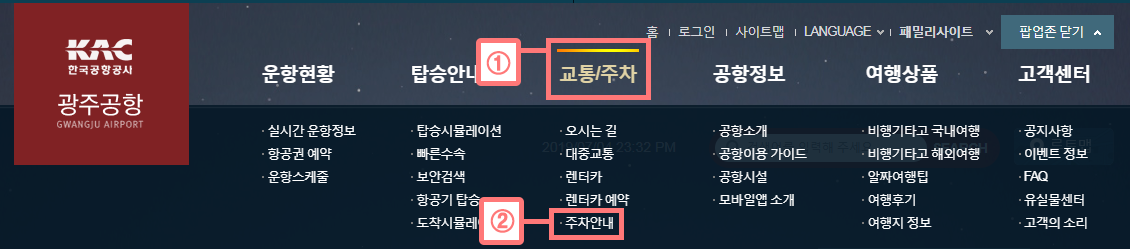 ▲ 광주공항 주차요금의 예상요금을 확인하려면 메뉴바의 [교통/주차] - [주차안내] 를 차례대로 눌러서 접속한다.