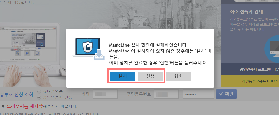 ▲ 만약 공인인증서로 본인인증을 할 시, 위와 같은 화면이 나올 수 있는데, 공인인증서 인증 보안프로그램이 설치되어 있지 않으면, [설치]버튼을 클릭하고, 이미 설치가 되있다면 [실행]버튼을 누르면 된다.