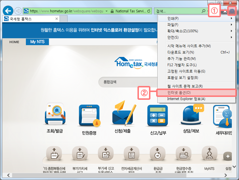 ▲ 먼저 국세청홈텍스는 인터넷 익스플로러로 이용하시는 것을 추천한다. msxml 3.0 sp11 팝업오류를 해결하기 위해서는 일단 인터넷 익스플로러로 접속한다.
