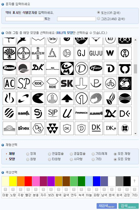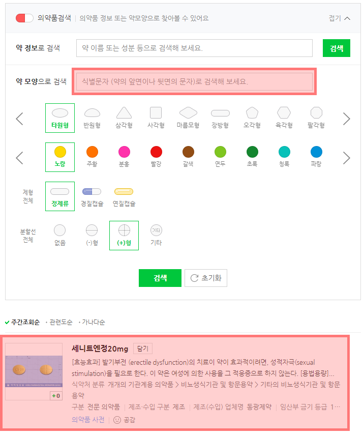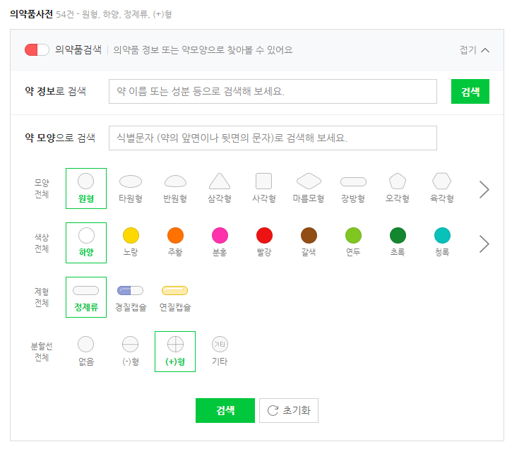 ▲ 네이버에서의 약 모양 검색과 비슷하게 틀이 잡혀있다. 똑같이 약의 제형, 약의 모양, 약의 색상들을 검색하여 검색버튼을 눌러준다.