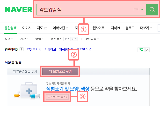 ▲ 먼저 우리는 의약품의 이름을 모르므로, 약 모양을 통해서 가지고 있는 의약품의 이름과 성분을 알아내보자. 네이버 검색창에 "약 모양 검색" 이라고 검색을 한다. 그리고, [약 모양으로 찾기] 를 클릭하고, [약 모양으로 찾기]버튼을 클릭한다.