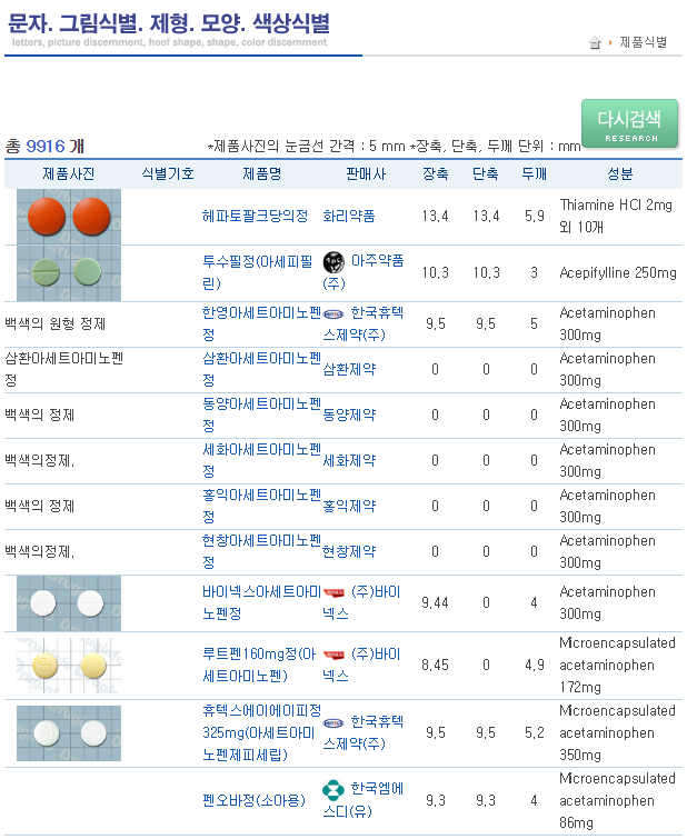 약을 자세히 보면 약의 앞면이나 뒷면에 문자나 숫자가 적혀있는데, 검색결과에 많은 약들이 검색된 경우, 식별문자까지 입력하면, 의약품명 검색에 더 정확도가 올라간다.