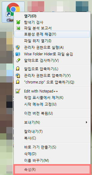 ▲ 크롬의 속성의 설정을 변경하여 크롬 실행 안됨 현상을 해결하는 또다른 방법이 있다. 바탕화면의 크롬아이콘에 오른쪽마우스를 클릭 한 뒤, [속성]을 클릭한다.