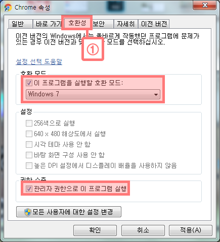 ▲ Chrome 속성에서 [호환성] 탭을 클릭한 후, 위 이미지와 같이 [이 프로그램을 실행할 호환 모드] , [관리자 권한으로 이 프로그램 실행] 의 체크박스에 체크를 해준다. 후에, [확인]버튼을 눌러 설정을 마친 다음, 크롬 브라우저를 실행 해보면 정상적으로 작동하는 것을 확인할 수 있다.
