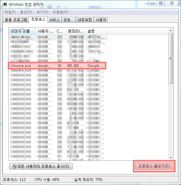 ▲ 가장 먼저 필자가 해결했던 방법이다. 크롬이 실행도 안됬는데, 작업관리자로 들어가서 프로세스들을 쭉 보면, chrome.exe 프로세스가 실행되고 있었다. 이 프로세스를 [프로세스 끝내기(E)] 를 클릭하여 종료시켜준다.