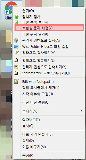 바탕화면에 있는 크롬 아이콘에 우클릭을 한 다음, 나타나는 창에서 [호환성 문제 해결(Y)]를 클릭한다.