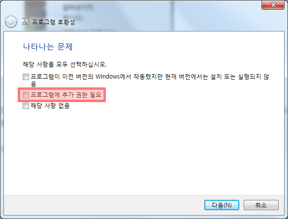 ▲ 윈도우7의 경우에는 위와 같은 창이 뜨면, [프로그램에 추가 권한 필요]를 체크해준 다음 [다음] 버튼을 클릭한다. 윈도우10 경우에는 [권장 설정 시도]를 눌러준다.