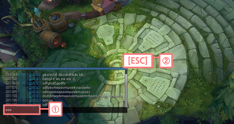 ▲ 롤 채팅입력창을 열고 아무글자나 적으신다음에 키보드 [ESC]를 눌러서 채팅입력창을 닫아줍니다. 그런다음 다시 채팅을 한/영 키를 눌러서 한글을 입력해보시면 한글이 신기하게도 입력이 됩니다.