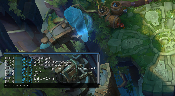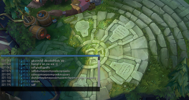 ▲ 먼저 첫번째 방법은 롤 인게임을 들어가시면 한글이 위 화면처럼 안처져서 답답한 경우가 많습니다. 이런경우에 채팅입력창을 엔터를 눌러서 열어줍니다.