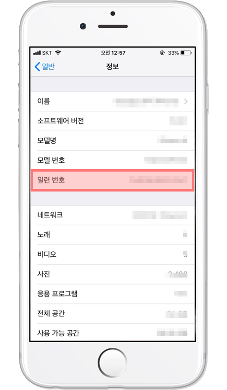 ▲ 정보메뉴에서 우리가 찾는 아이폰 imei 조회를 할 수 있습니다. 알파벳(대문자)과 숫자로 이루어져 있는 것을 확인하시고 확인 해주시면 됩니다.