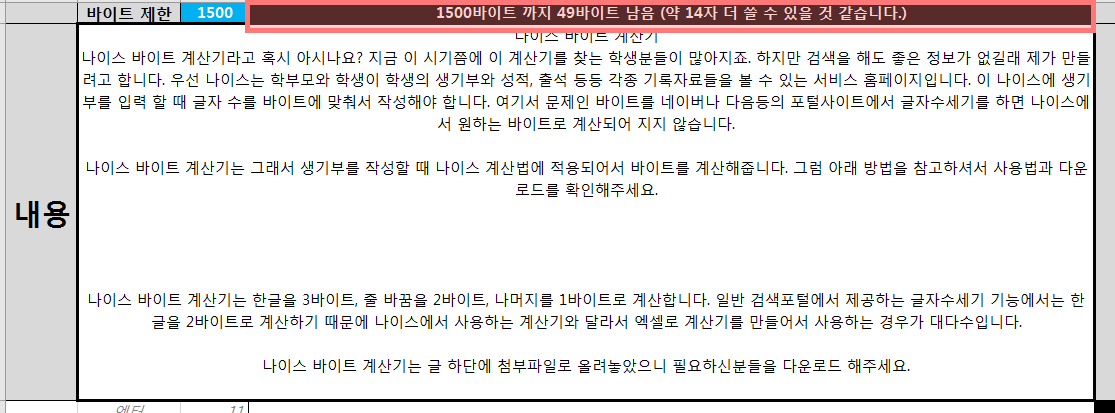나이스 바이트 계산기는 한글을 3바이트, 줄 바꿈을 2바이트, 나머지를 1바이트로 계산합니다. 일반 검색포털에서 제공하는 글자수세기 기능에서는 한글을 2바이트로 계산하기 때문에 나이스에서 사용하는 계산기와 달라서 엑셀로 계산기를 만들어서 사용하는 경우가 대다수입니다.