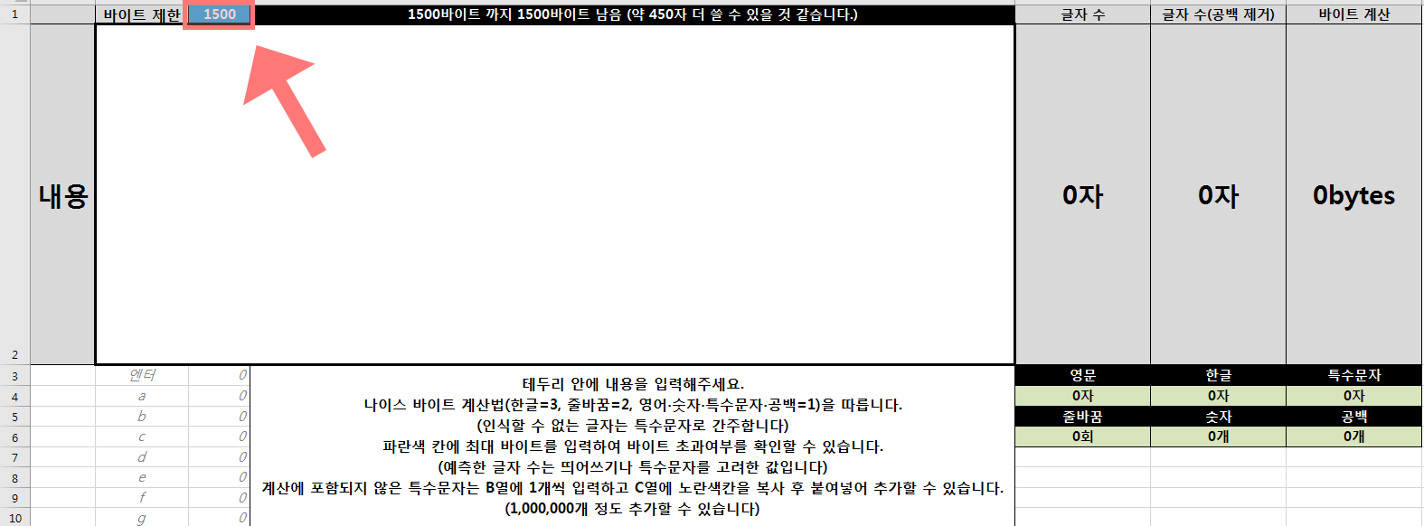 나이스 바이트 계산기의 세밀한 기능이 있는데 내용 입력란 위에 내용을 입력하실때 몇바이트가 남았고, 글자수를 몇 자 더 쓸수 있는지도 실시간으로 업데이트 되시는 것을 볼 수 있습니다. 꿀 기능이니까 활용해보세요. ▼