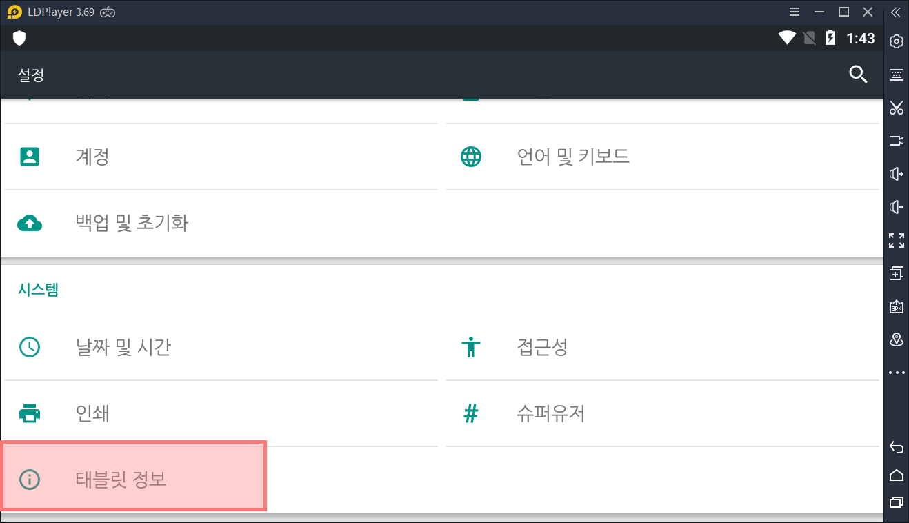 화면을 맨아래까지 스크롤하여서 내려주세요. 시스템 항목들중에서 [태블릿 정보]를 클릭해주세요.