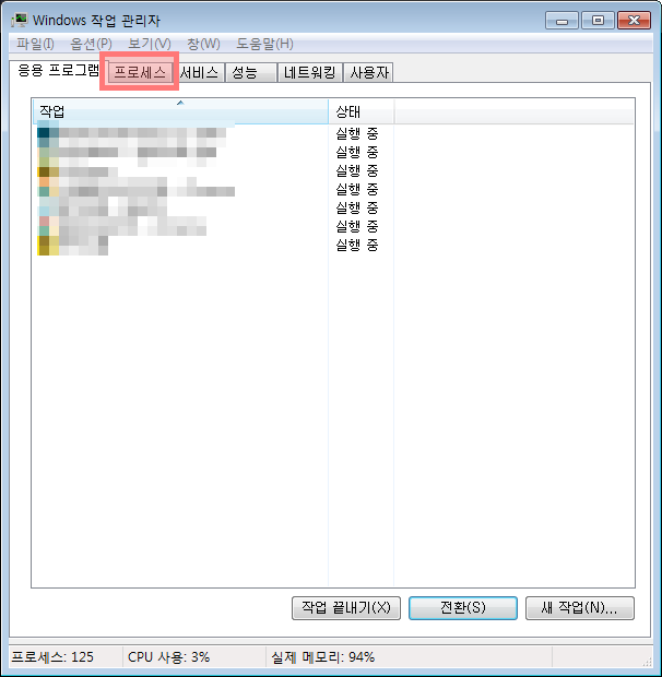 LD플레이어 최적화 두번째 방법은 작업관리자를 이용하여 LD플레이어 프로세스를 다른 프로세스보다 우선순위로 설정하여서 리소스에 우선으로 접근하게 하여서 성능을 향상시켜줄 수 있습니다. [CTRL] + [SHIFT] + [ESC] 버튼을 같이 눌러서 작업관리자 창을 실행시켜줍니다. 실행 후 [프로세스] 탭을 클릭해주세요.
