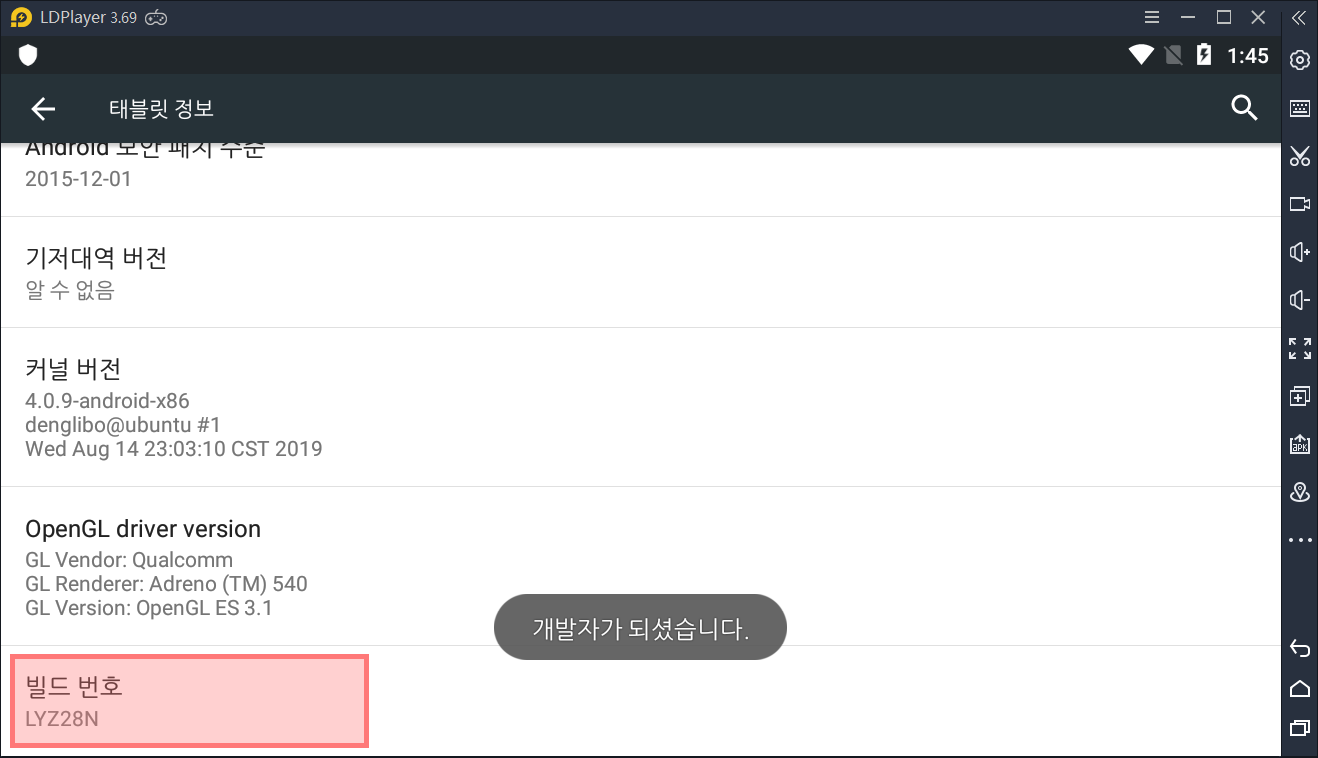 태블릿 정보의 또다시 맨아래로 스크롤해주시고, [빌드 번호]란을 클릭을 여러번해주시면 아래이미지와 같이 '개발자가 되셨습니다' 라는 문구가 뜨면, 이제 LD플레이어 최적화 설정을 위한 [개발자 옵션]으로 접근이 가능하게 됩니다.