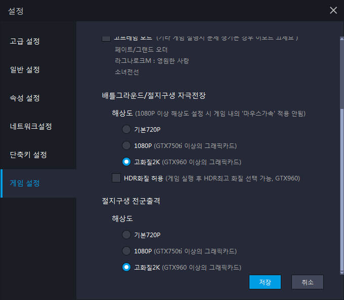 설정창의 마지막으로 게임 설정을 보시게 되시면, 모바일 배틀그라운드와 절지구생 게임의 화질을 고화질2K로 설정이 가능합니다. GTX960 이상의 그래픽카드를 사용하시면 고화질2K로 설정해서 게임을 시작해보세요.