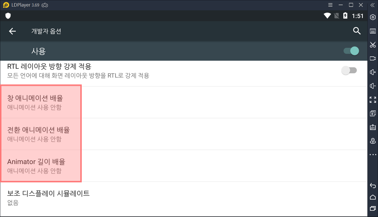 LD플레이어 최적화 체감을 확 느끼시고 싶으시다면 개발자 옵션의 창 애니메이션 배율, 전환 애니메이션 배율, 애니메이터 길이 배율을 모두 사용안함으로 변경해주세요. 그러시면 애니메이션이 모두 없어져서 빨라진 체감이 느껴집니다.