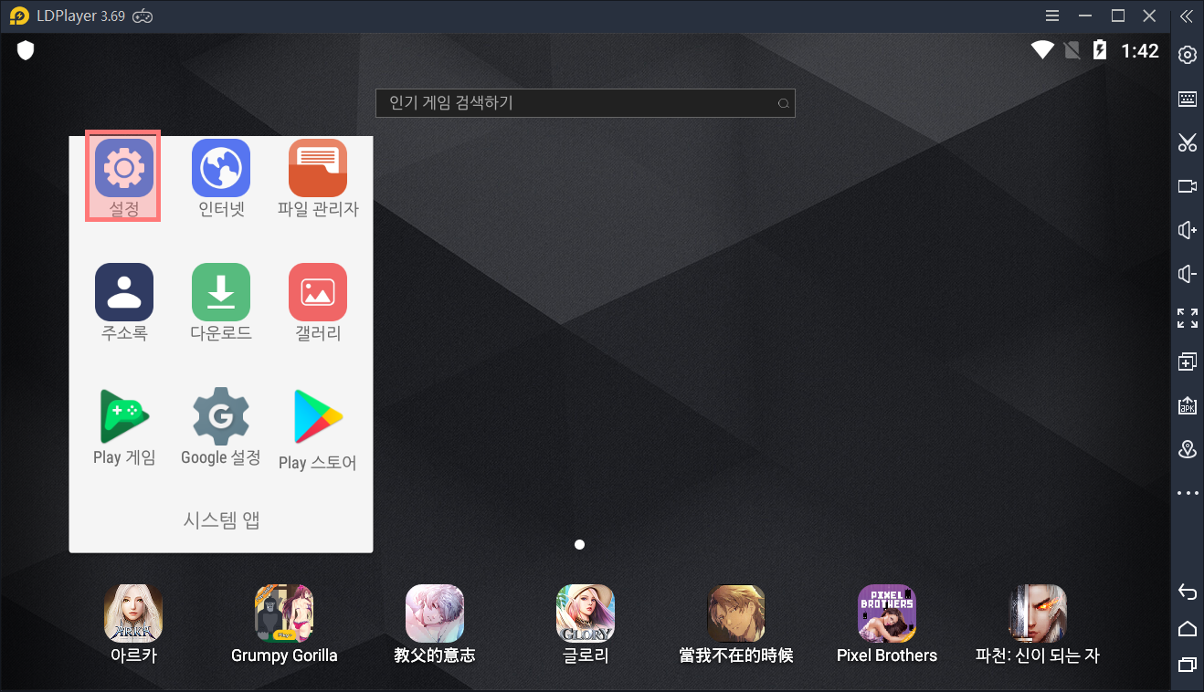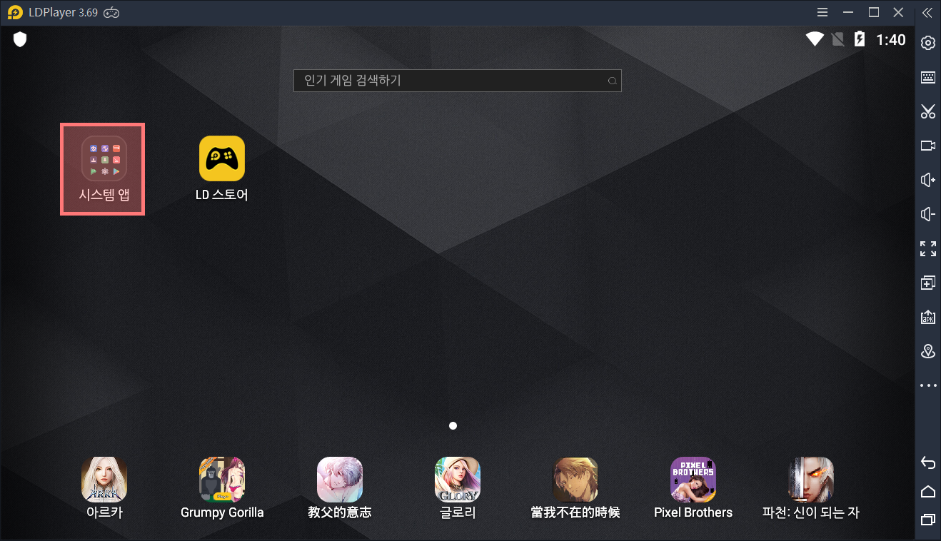 LD플레이어 최적화 세번째 방법입니다. 스마트폰의 설정에 들어가서 휴대폰 성능을 최적화 많이들 해보셨나요? 똑같은 방식으로 이 앱플레이어의 설정에 들어가서 설정을 조금 변경할겁니다. 홈화면의 [시스템 앱] 폴더를 클릭해주세요.