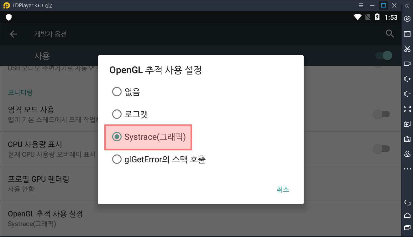 마지막으로 쭉쭉 스크롤을 내리다보면 LD플레이어 최적화 마지막방법인 OpenGL 추적 사용 설정을 클릭해주신 다음, Systrace(그래픽) 항목을 클릭하여 설정해주세요.