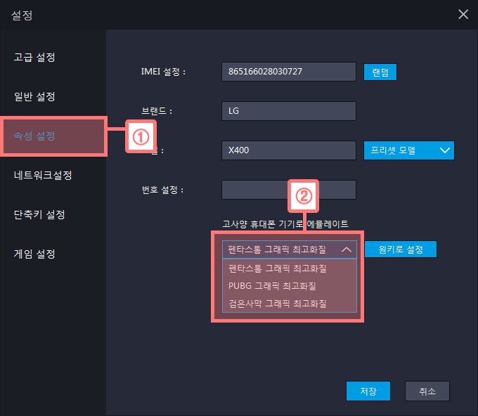 일반 속성 다음으로 속성 설정 메뉴를 클릭해주세요. 보시면 LD플레이어를 통해 플레이 하시는 게임들을 대상으로 최적화를 하실 수 있습니다. 펜타스톰, 배틀그라운드, 검은사막 그래픽 최고화질 설정을 골라서 적용이 가능합니다.