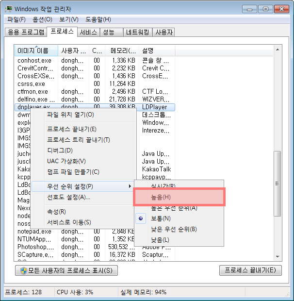 [프로세스] 탭에서 프로세스 중 dnplayer.exe 라는 프로세스를 찾아주세요. 찾은프로세스를 마우스 오른쪽 클릭을 하고, [우선 순위 설정] - [높음] 으로 설정해주시면 LD플레이어 최적화 완료됩니다.