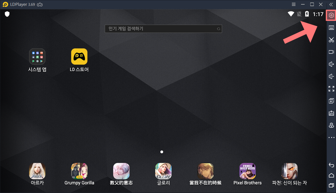 LD플레이어 최적화 방법에는 여러가지가 있습니다. 총 3가지 방법을 소개해드리겠습니다. 3가지 방법을 다 설정해주시는 것을 추천할게요. 우선 LD플레이어를 실행시켜주세요. 프로그램 로딩 후 아래와 같이 홈화면으로 실행이 되시면 오른쪽에 위치되어있는 톱니바퀴모양의 아이콘(설정)을 클릭해주세요.