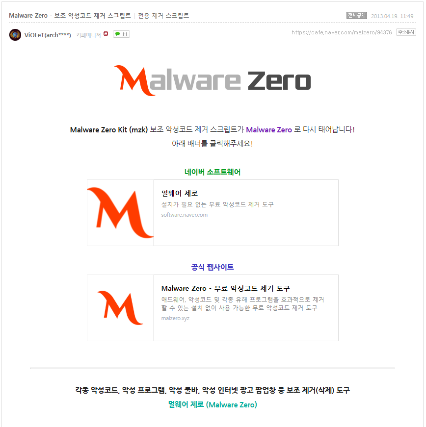 ▼ 네이버 카페에서도 Malware Zero - 보조 악성코드 제거 도구를 네이버 자료실 혹은 공식 웹사이트에서 mkz 다운로드 받으라고 링크를 걸어두었습니다. 저는 자주 이용하는 네이버를 통해서 다운로드 받겠습니다.