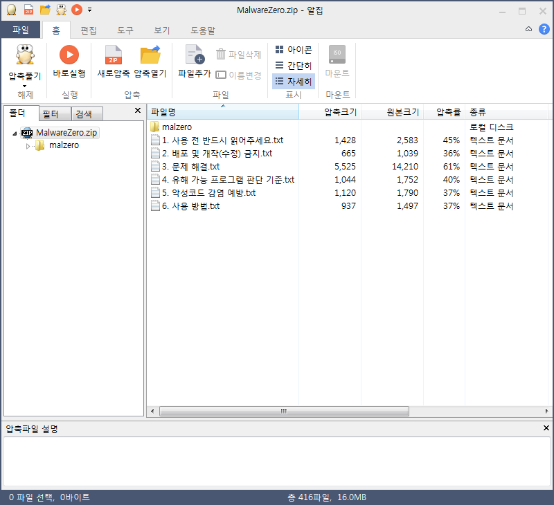 ▼ MalwareZero.zip 압축파일을 압축해제 해주세요. 압축된 파일은 malzero 폴더와 주의점 및 사용 방법에 대한 텍스트파일이 들어있습니다.