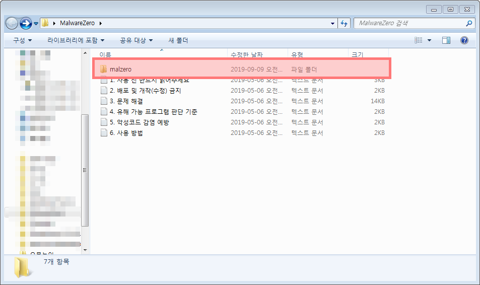▼ MalwareZero.zip 압축파일을 압축해제 해주세요. 압축된 파일은 malzero 폴더와 주의점 및 사용 방법에 대한 텍스트파일이 들어있습니다.