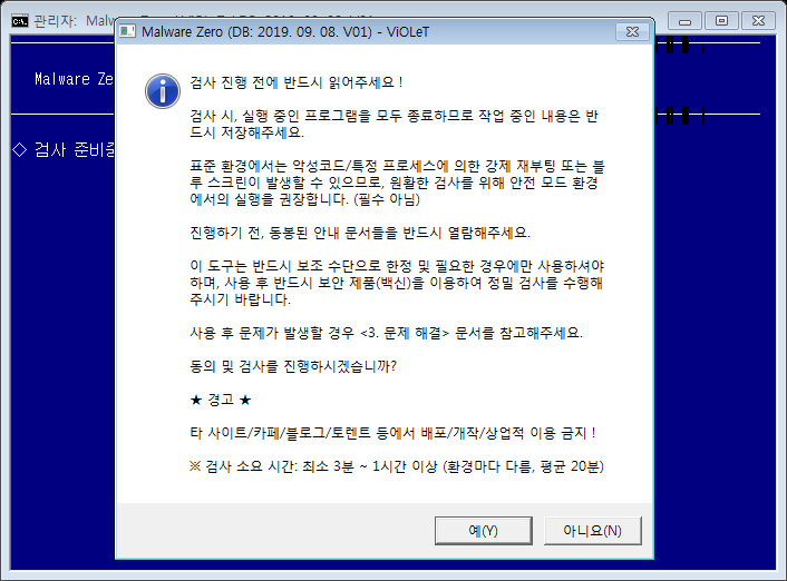 ▼ 조금만 기다려주시면 아래 이미지와 같이 창이 바뀌게 되고 알림창이 하나 뜨게됩니다. [예]를 누르게 되면 컴퓨터 검사가 시작되며, 실행중인 모든 프로그램이 종료됩니다. 작업중인 문서나 웹사이트가 있다면 나중에 검사를 실행시켜주세요. 생각보다 오래걸리므로 시간 여유가 있으실 때 검사하시는 것을 추천드립니다.