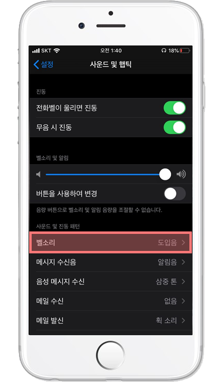 ▼ 아이폰 진동세기 또는 진동패턴은 전화가 왔을 때 주로 쓰이므로, 벨소리 메뉴에 진동세기를 변경할 수 있습니다. 사운드 및 진동 패턴 탭에 위치한 [벨소리]를 터치하여 접근해주세요.