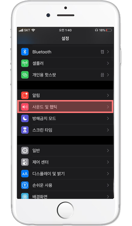 ▼ 설정앱을 들어가신 다음, 아래로 조심만 스크롤하여서 내려주시면 두번째란에 위치한 [사운드 및 햅틱]을 터치하여서 접근해주세요.