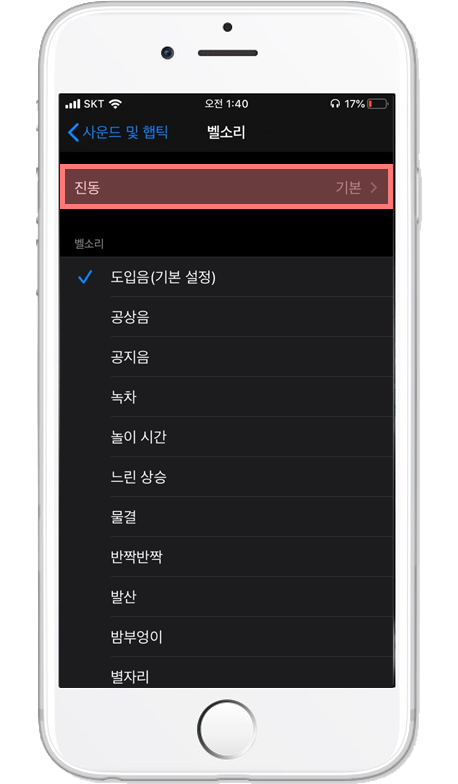 ▼ 벨소리 화면으로 오셨으면 여기서 무음모드가 아닐때 벨소리를 변경할 수 있습니다. 아이폰의 기본 벨소리인 모두가 잘 아시는 벨소리말고 다른 벨소리로 변경하고 싶으면 벨소리들을 터치하여 들어보시고 변경해보세요. 그 외 아이폰 진동세기를 변경하시려면 상단에 위치한 [진동]을 터치해주세요.
