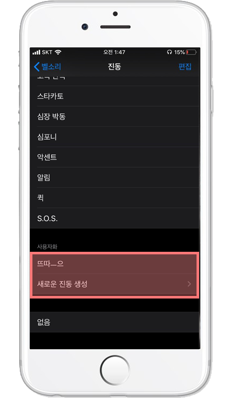 ▼ 마음에 드는 진동 패턴이 없으시다면 직접 새로운 진동을 생성할 수 있습니다. 스크롤을 조금 내리시면 하단에 [새로운 진동 생성]을 터치하셔서 진동을 만들어보세요. 저도 하나 재미로 만들어봤는데 마음에 듭니다. ㅎㅎ