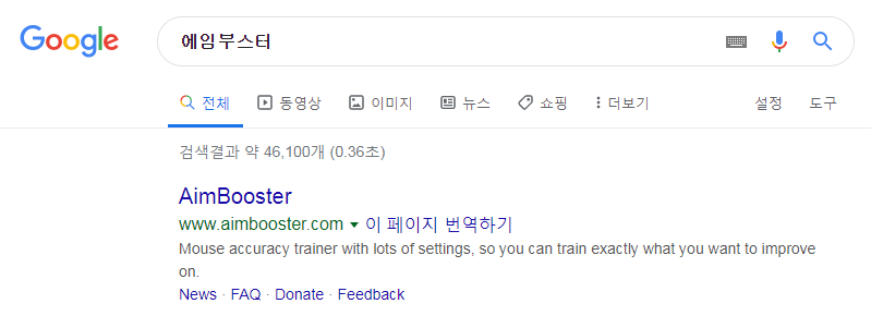 ▼ 먼저 제가 여러분께 추천드리는 에임연습사이트는 'AimBooster' 라는 사이트입니다. 에임부스터는 구글검색창에 에임부스터라고 치시면 가장위에 링크를 통해서 접근하실 수 있습니다. 또는 이 링크는 클릭하여 바로 접속해주세요.
