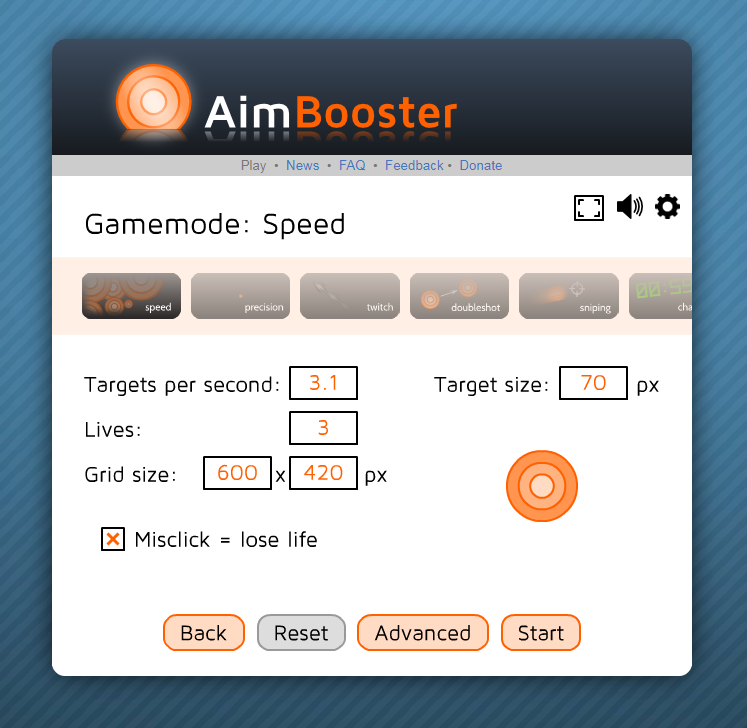 ▼ 에임연습의 원하는모드를 클릭하시면 목표타켓의 나오는빠르기와 생명수, 타켓의 크기, 클릭을 잘못하면 생명수가 줄어드는지 안드는지에 대하여 설정을 하실 수 있습니다. 원하시는 설정을 하신 다음 [Start] 버튼을 클릭해주세요.