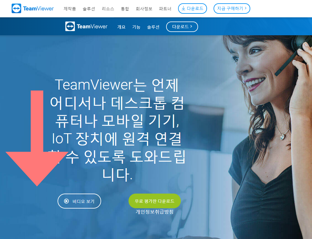 ▼ 팀뷰어 홈페이지에 접속하시면 아래 이미지와 같이 메인화면이 뜨는데 다운로드 버튼을 클릭하시지 마시고 마우스 스크롤을 쭉 내려 홈페이지 하단으로 내려가주세요.