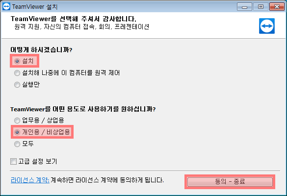 ▼ 팀뷰어14 다운로드 버튼을 클릭하시게 되시면 설치파일은 exe파일이 다운로드가 되고, 실행하시게 되시면 아래와 같이 팀뷰어 설치창이 나타납니다. 아래 설정과 같이 하셔도 되시고, 설정을 다르게 하시고 싶으시다면 [고급 설정 보기] 체크박스를 체크해서 설정후에 [동의 - 종료] 버튼을 클릭해주세요.