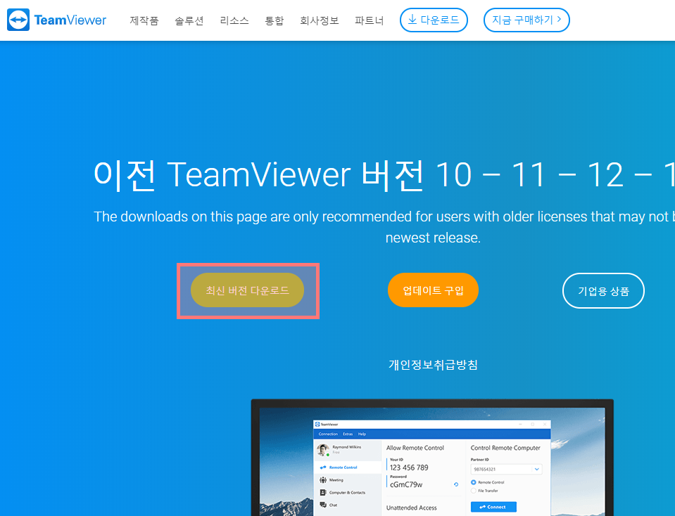 ▼ 팀뷰어 14 다운로드 뿐만아니라 그 전의 버전 팀뷰어10,11,12,13 까지도 원하는 버전으로 다운로드할 수 있습니다. 하지만 우리의 목적은 최신버전 다운로드이기 때문에 가장 왼쪽에 [최신 버전 다운로드] 녹색 버튼을 클릭해주세요.