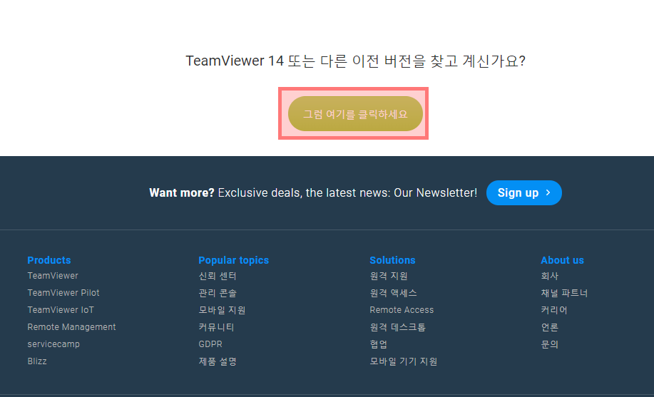 ▼ 홈페이지 하단으로 쭉 내려보시면 [TeamViewer 14 또는 다른 이전 버전을 찾고 계신가요?] 멘트가 나오고 아래 초록색 버튼이 나옵니다. 팀뷰어14 다운로드를 하기 위해서 초록색 버튼을 클릭해주세요.