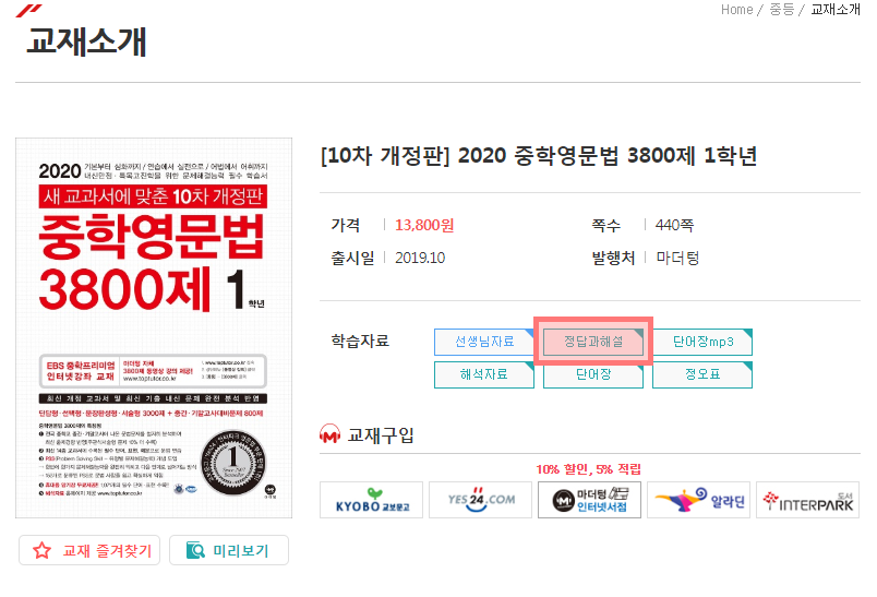 ▼ 교재를 클릭하면, 교재를 구입할 수 있는 링크와 설명이 있고 또 다양한 학습자료를 다운로드 할 수 있습니다. 저희는 교재의 답지가 필요하기 때문에 학습자료란에 [정답과해설] 버튼을 클릭해주세요.