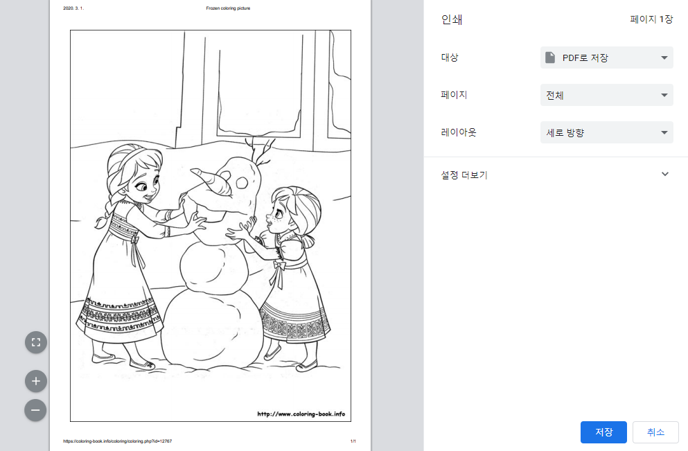 ▼ 엘사 색칠공부 도안말고도 안나 색칠공부 도안, 올라프 등등 겨울왕국 캐릭터들 도안까지 업로드 되어있으니 마음에 드시는 것들을 선택해주신 다음에, 상단에 프린트모양의 아이콘을 눌러주세요.